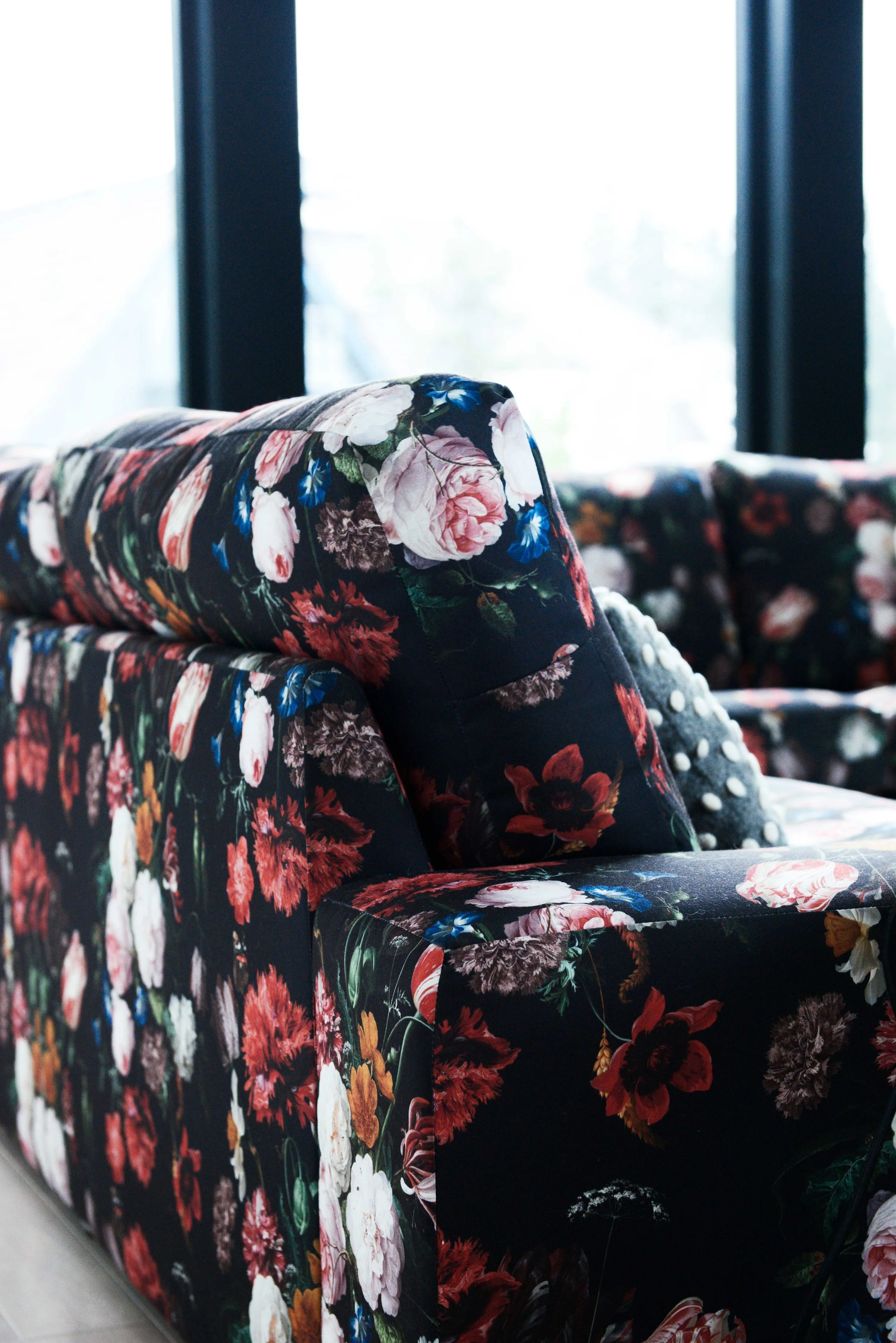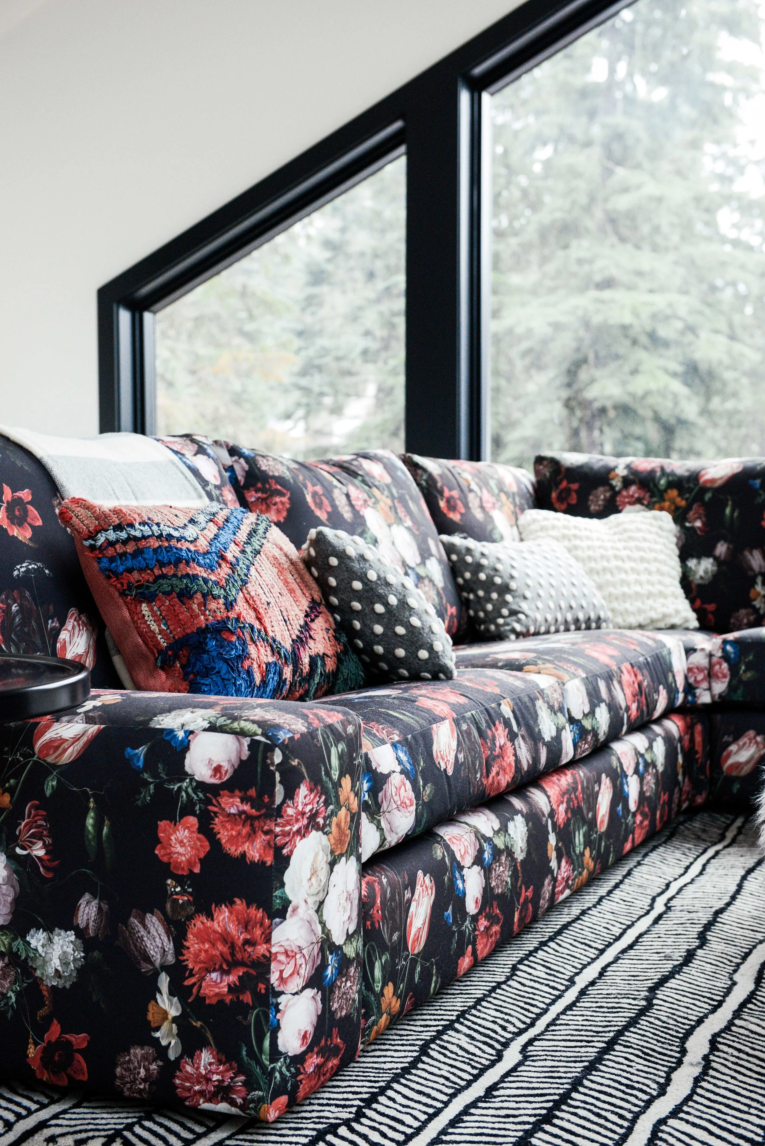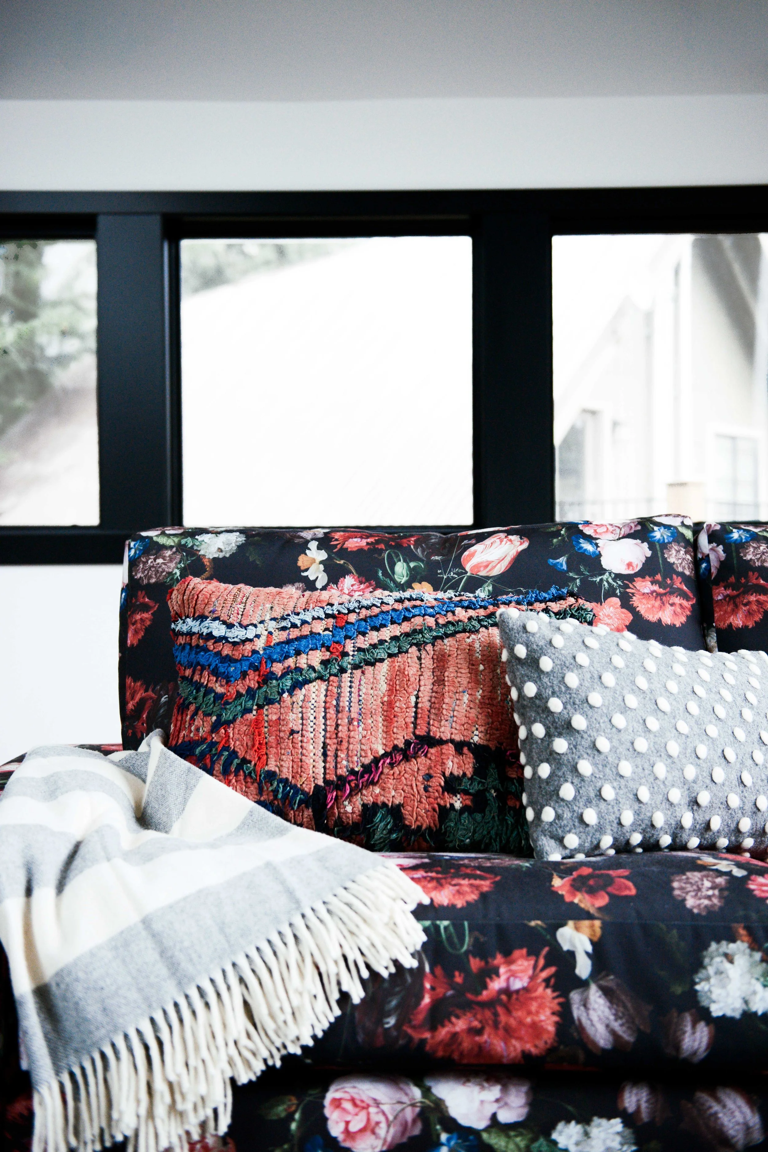 I've never actually made a pattern before so I had no idea what I was getting myself into. Thank goodness for tutorials and Skillshare guiding me along the way. There was a lot of trial and error. Before I even finished the pattern, I had to find a place to print. I ordered sample fabrics from Spoonflower and did multiple test prints. You can print a full yard or a fat quarter to test repeat, scale and color. In the end, we used their eco canvas. I was impressed with the overall quality of the print, especially for the price. Once printed, we shipped the fabric to be treated with a UV protectant and stain guard which we also had to sample to make sure it didn't change the color or the texture of the fabric. We then delivered it to our upholsterer and put it on a naked Ikea couch. Did you know you can buy Ikea furniture for a slightly lower price without fabric and add your own? The Dutch are doing it right people, can we all just get on board with these innovative ideas?